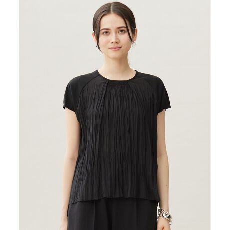 目を惹くデザインと快適な着心地の異素材コンビトップス■デザインランダムプリーツがポイントの表情豊かな布帛に着心地の良いニット素材を合わせた異素材コンビトップスです。襟前中心にはシャーリング加工を入れてブラウスのようなきちんと見えする上品な印象に仕上げました。■素材ニット部分は、セルロースとポリエステルの混紡糸を使用し着心地の良さはもちろん、表面の適度な光沢感が美しい素材です。前身頃の布帛部分は、程良い透け感とふわりとした軽さを持つ梨地ジョーゼットにランダムなプリーツを施しました。■同素材アイテムワンピース(OPWMGA0032)