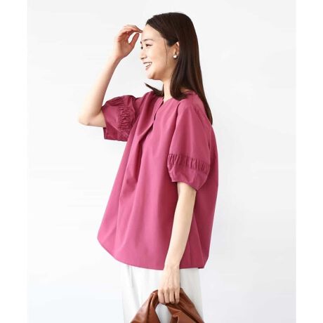 丸みのあるランタンスリーブは、ボリューム感とギャザーの入ったパーツにこだわり、大人の女性にちょうどいいブラウスに仕上げました。ゆとりのあるシルエットに、首元はキーネックデザインにすることで女性らしい印象に。