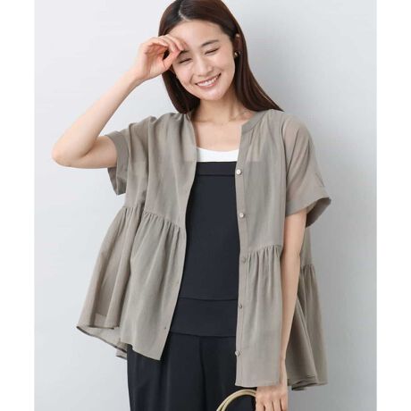 たっぷりギャザーが1枚でふんわりと可愛いチュニック丈のブラウス。釦を閉めればトップスとして、開けて羽織りとしても着回しが利きます。ヒップがしっかり隠れるチュニック丈は腰周りがカバーできるのも嬉しい。