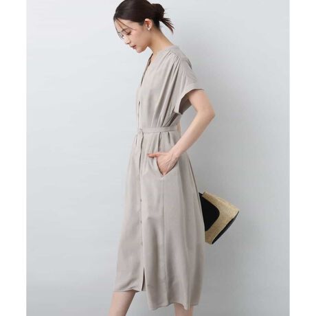 リラクシーなシルエットと程よく開いたキーネックデザインが首周りをすっきりと見せてくれるワンピース。着脱のラクチンな前釦仕様で、両脇ポケット付きも嬉しい。