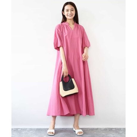 たっぷりとしたボリュームのあるコットンワンピース。デコルテがきれいに見えるスリットネックとラクチンな着心地のシルエットが着心地◎。袖はバルーンスリーブに仕上げ、デザインのアクセントに。