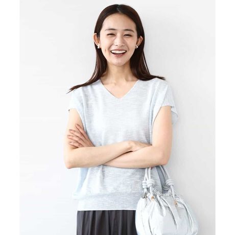 ほんのり光るラメが上品な印象のニットプルオーバー。デコルテラインをすっきり見せる浅めのVネックで二の腕もふんわりとカバーするフレンチスリーブデザインです。