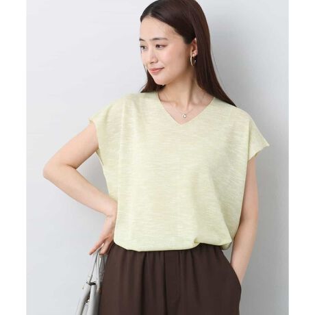 ほんのり光るラメが上品な印象のニットプルオーバー。デコルテラインをすっきり見せる浅めのVネックで二の腕もふんわりとカバーするフレンチスリーブデザインです。
