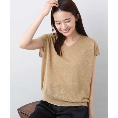ほんのり光るラメが上品な印象のニットプルオーバー。デコルテラインをすっきり見せる浅めのVネックで二の腕もふんわりとカバーするフレンチスリーブデザインです。