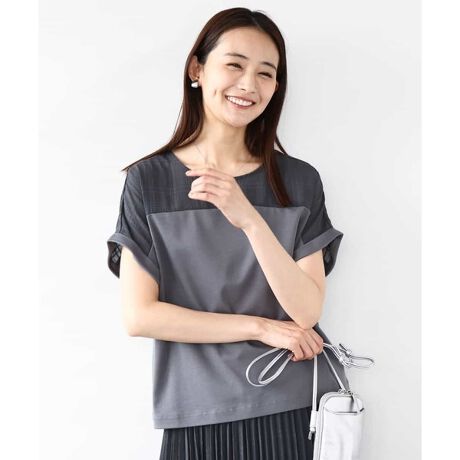 伸縮性のいいカットソー素材と表面感のあるシアーチェックの楊柳素材を切り替えており、着心地の良さと一枚で決まるデザイン性のどちらもカバー。使用。カットソー部分は程よい肉感があり透けにくいのもの嬉しい。
