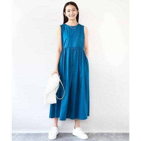 トップス部分はシンプルなノースリーブ、切替え下のスカート部分はタックとギャザーで華やかな分量感のワンピース。ウエスト部分はドローコードゴムを入れ、シルエットとサイズ感を調節して着こなしを楽しめます。