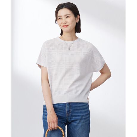 ■デザインメッシュ編みを施した、見た目も涼しげなニット。軽やかな透け感が大人の抜け感を演出し、夏の装いに表情を添えてくれます。気になる二の腕をカバーする袖丈で、安心感のある着心地も魅力です。ほんのりと存在感を放つチェック柄は、トレンドを押さえつつ、スタイリングに華やかさをプラスします。風通しの良い程よくゆとりのあるシルエットで、さらっと快適な着心地を実現。1枚でコーディネートが決まり、パンツにもスカートにも合わせやすい万能トップスは、夏のワードローブに加えたい1着です。カラーは、柔らかく親しみやすいライトベージュ(#303)、女性らしさを引き立てるピンク(#312)、パッと目を惹く爽やかさのアクアグリーン(#361)、オンオフ兼用で大人なネイビー(#375)の4色で展開します。