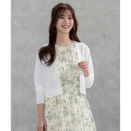 ・ワンピース合わせにぴったりなショート丈カーディガン・サラッとした気持ちの良い肌触りで、夏の冷房対策にも最適・部分的に繊細な細いラメが入っており、ベーシックながらも上品な雰囲気を演出