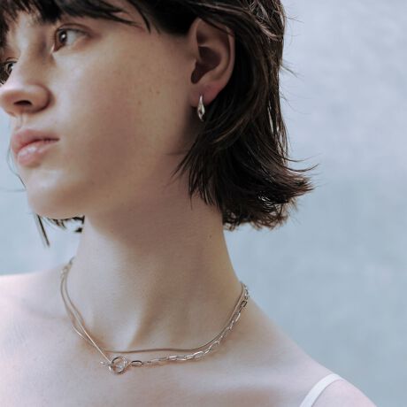 2種類のチェーンを組み合わせた動きのあるデザインは、シンプルながらも首元で存在感を発揮。