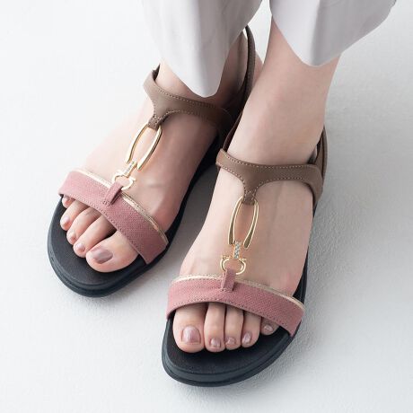 フロントのダブルリングメタルパーツがアクセントのサンダル。