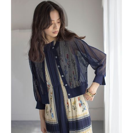■デザイン・トレンドのメッシュカーディガン。・ゆったりとしたサイズ感と前後差レングスはバランスが良く重宝間違いなしの羽織りアイテム。・涼しく着られトレンドスタイルも叶う今年イチオシのカーディガン。・夏らしい涼し気なクリスタル調釦がポイント。