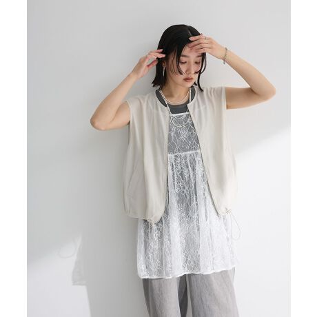 ライトな着心地が嬉しいシアーZIPベスト。裾ドロストを絞って旬テイストなバルーンシルエットにアレンジした着こなしもお楽しみいただけます。程よくゆとりを持たせたサイジングも魅力的。いつものコーディネートにプラスオンするだけで洒落感のあるレイヤードスタイルがキマるおすすめのアイテムです。透け感[ややあり]