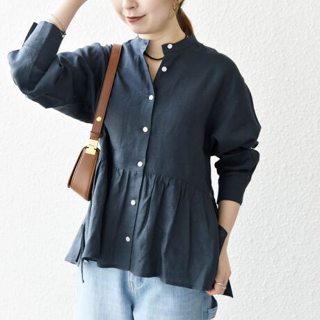 ウエストのペプラムギャザーが目を惹く、リネン混のシャツ。