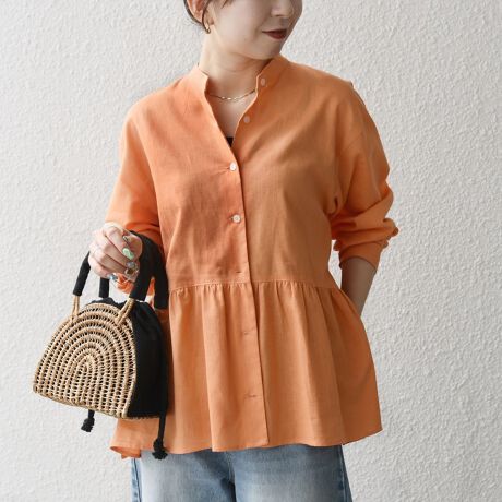 ウエストのペプラムギャザーが目を惹く、リネン混のシャツ。