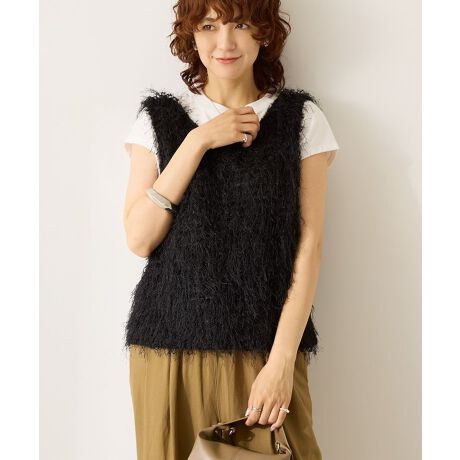 シャギーフリンジが洒落感たっぷりのニットベスト。顔周りをすっきり魅せてくれるVネックとシンプルなラウンドネック、前後2WAYの着こなしがお楽しみいただけます。サイドに加えたスリットがさりげなく抜け感を演出。一枚プラスするだけで印象的なスタイリングに仕上げてくれるおすすめのアイテムです。透け感[ややあり]