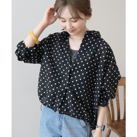 レトロテイストなドット柄が目を惹くデザインシャツ。ゆったりとしたワイドな身幅に前後差を付けたラウンドヘムが洒落感溢れるデザインです。サイドに配したドロストを絞れば、丸みを帯びたフェミニンなフォルムにアレンジ可能。オンするだけで、いつものスタイルをアップデートしてくれるおすすめの1枚です。透け感[ややあり]