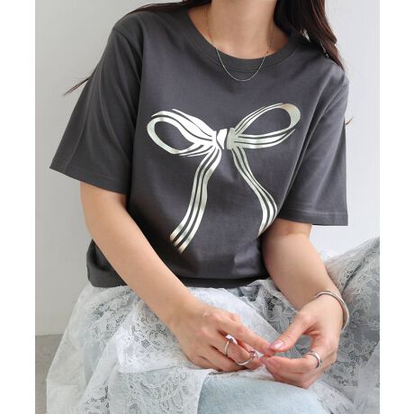 BIG リボン プリント ショート丈 半袖 Tシャツ Freesia フリージア