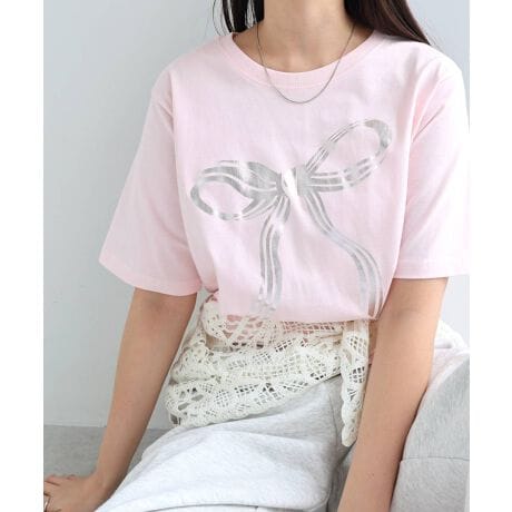 BIG リボン プリント ショート丈 半袖 Tシャツ Freesia フリージア
