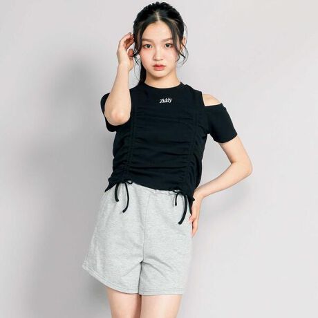 この夏の主役は、肩開きデザインがちょいセクシーなTシャツと、ウエストゴムでラクかわショートパンツの2点セット!