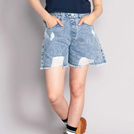 ダメージ加工&Aライン台形シルエットで、脚をキレイに見せてくれるショートパンツ。