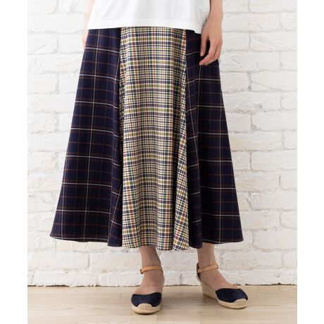 柄が異なる2つのチェック柄をパッチワーク風に切り替えたスカート。