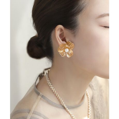 煌めくメタルフラワーと添えられたパールが、耳元に華やぎを与えるピアス。ボリュームのあるサイズが目を惹き、コーデのアクセントになります。※ATTENTION※■微細なキズや製造ムラはすべての商品に含まれます。[型番:M2130100P]