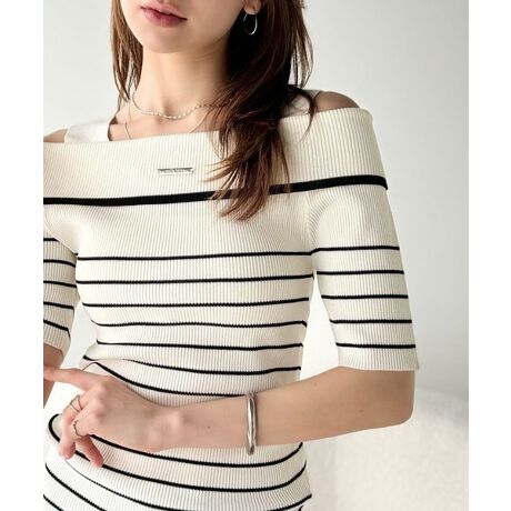 上質なリブ素材を採用し、肌に心地よくフィットする快適な着心地を追求したプレート使いオフショルニット。