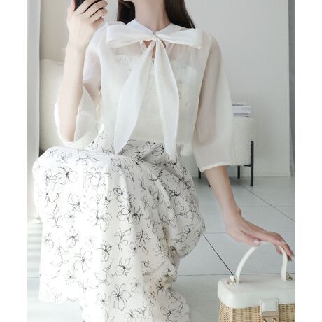 優しいアイボリー色のブラウスは、前でリボンを結べば清楚な印象に。