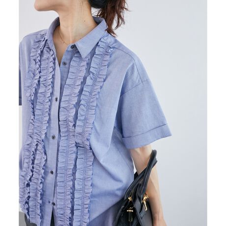 シンプルなレギュラーカラーシャツをベースに、フリルディティール取り入れた、1枚で着映えするデザインシャツ。