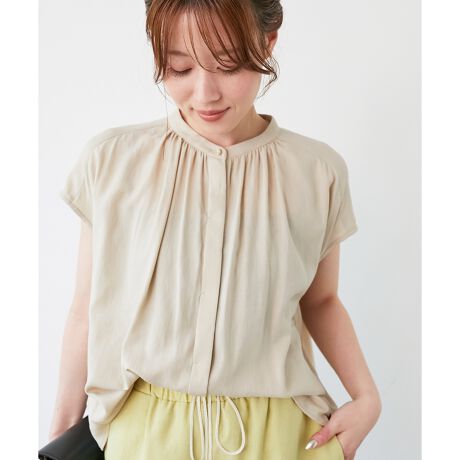 衿ぐりのギャザーがほどよい華やかさをプラス。身体のラインを拾いすぎず1枚でも安心して着ていただけます。