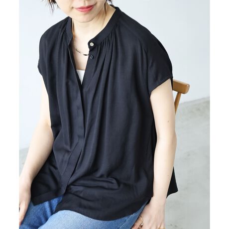衿ぐりのギャザーがほどよい華やかさをプラス。身体のラインを拾いすぎず1枚でも安心して着ていただけます。