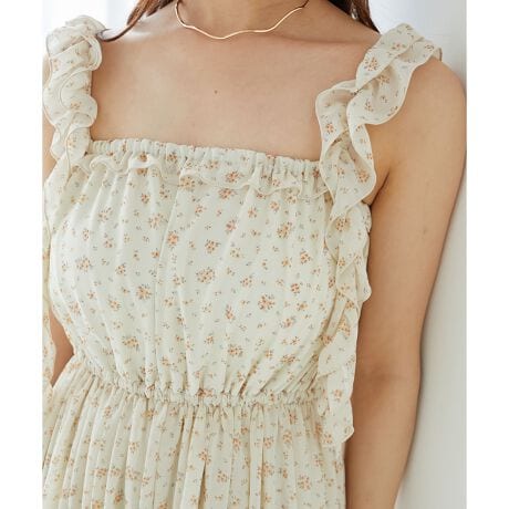 フリルデザインの肩紐が印象的な、エレガントなティアードワンピースです。