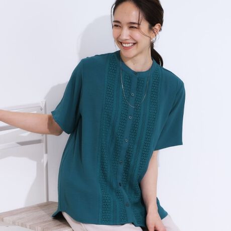 人気のしわになりにくく、清涼感のある素材を使用し、前身頃にレースをあしらったブラウスです。