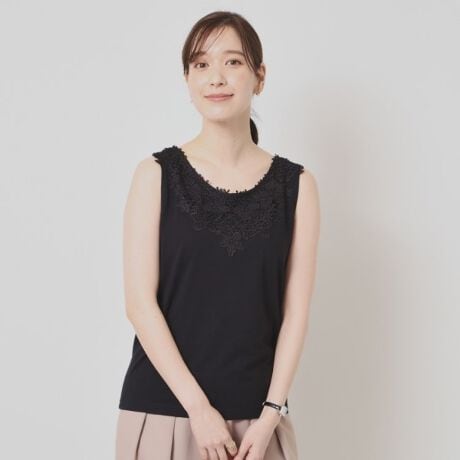 胸元に華やかなレースをあしらったデザインで、シンプル過ぎずコーディネートのアクセントになります。