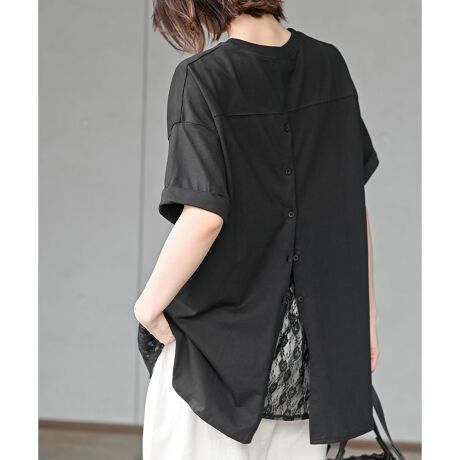 後ろ姿をおしゃれに演出してくれるボタンデザインTシャツ。