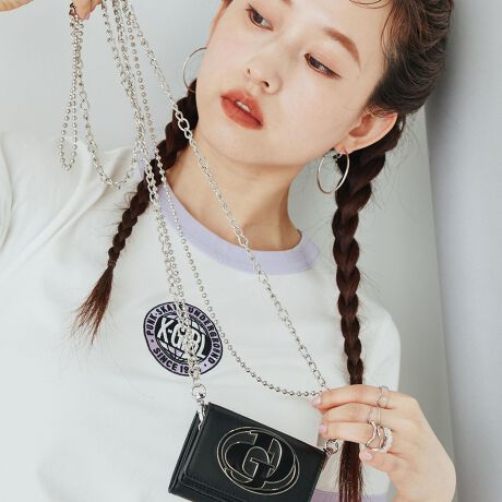 チェーンショルダーにはボールチェーンとランダムな大きさのチェーンの2種類を使用し、財布でありながらアクセサリーの間隔でお持ちいただく事が可能に。