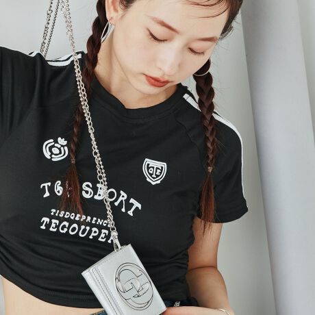 チェーンショルダーにはボールチェーンとランダムな大きさのチェーンの2種類を使用し、財布でありながらアクセサリーの間隔でお持ちいただく事が可能に。
