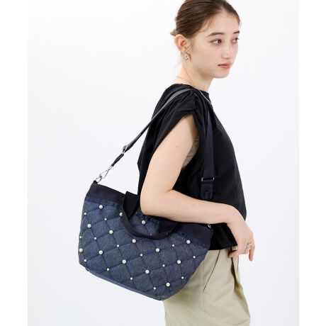 ネイビー(紺)のデニム調生地に、ホワイト(白)のパールを合わせ、華やかさと高級感をプラス。カジュアルからパーティーシーンまで、コーディネートのアクセントとして幅広くお使いいただけます。