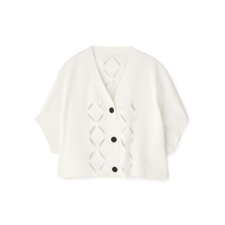モチーフをくり抜いたようなデザインが印象的なニットカーディガン