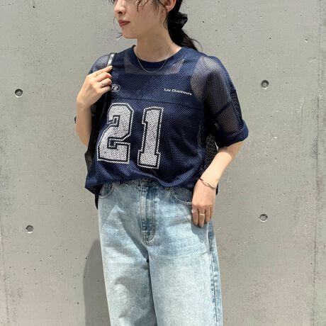・メッシュ素材の生地に存在感抜群なナンバーロゴがプラスされたスポーティーなTシャツです