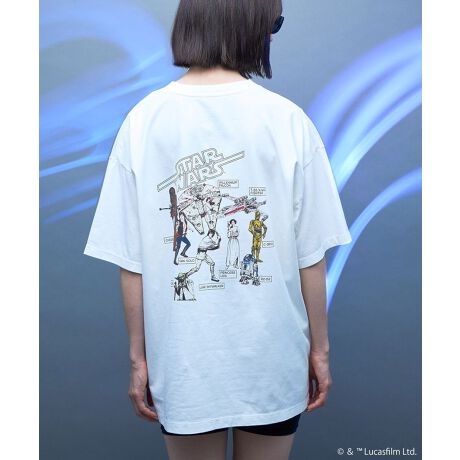 「ルーク・スカイウォーカー」と仲間たちがバックにプリントされたTシャツ。「ヨーダ」、「R2-D2」、「C-3PO」、「ハン・ソロ」、「チューバッカ」、「レイア姫」、「ミレニアムファルコン号」、「T-65 Xウイングファイター」など、キャラクターたちの名前が描かれているのもポイントです。フロントには『STAR WARS』のタイトルロゴがブラックの糸で刺繍されており、デイリーでも使いやすいデザイン。ウォッシュ加工を施し、ヴィンテージ感のある柔らかな風合いに仕上げました。ユニセックスで着用可能な大きめのサイズ感なので、カップルや友達同士でお揃いのスタイルも楽しめます。デニムに合わせたカジュアルなスタイリングはもちろん、フレアスカートなどフェニミンなアイテムと合わせることでこなれた印象に。