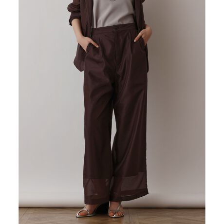 オーガン素材でお作りした、シアー感のある涼やかなワイドパンツ。 ワッシャー加工を施したニュアンスのある素材が、かしこまりすぎない旬な雰囲気を纏います。タックを入れたワイドなシルエットながらルーズになり過ぎず、きちんと見えも同時に叶えてくれる大人な品格漂う一本。バックウエストはゴム仕様にし、リラックスした穿き心地を実現しました。シックな大人の夏コーデに投入したいブラウン、綺麗めスタイルにもぴったりなキナリの2色展開です。