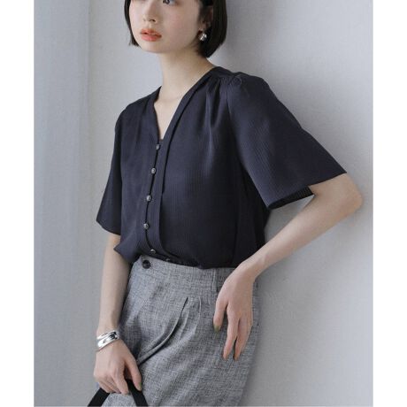 デコルテがきれいに見えるすっきりとしたVネックと小さなフロントボタンがアクセントになり、1枚で着映えするアイテムです。