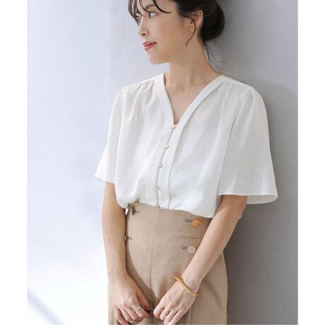 デコルテがきれいに見えるすっきりとしたVネックと小さなフロントボタンがアクセントになり、1枚で着映えするアイテムです。
