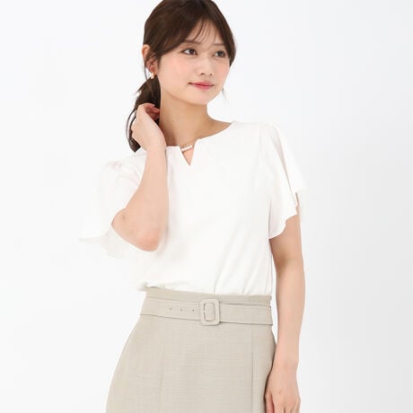パールラインがきらめく、キーネックフレアスリーブブラウス