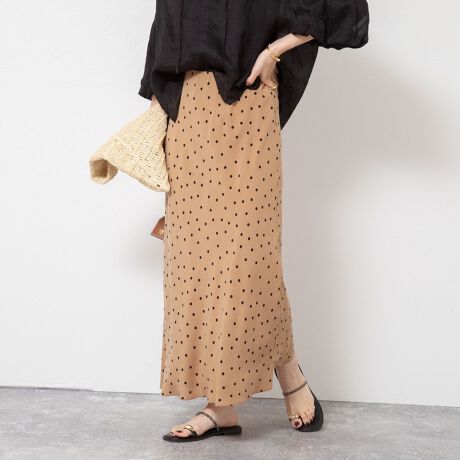 ・微光沢のある上品な生地にドットプリントが施されたナロースカート
