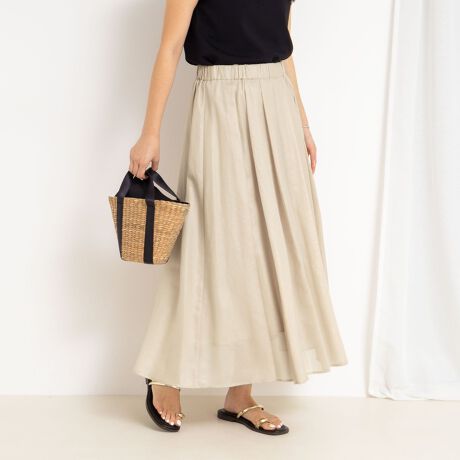 シアーで光沢のある麻のような高級感のある素材。ポリエステルなのでしわにならず扱いやすいです。ベルトループがあるので紐ベルトを通してはいています。ポケットがないので星4つにしました。