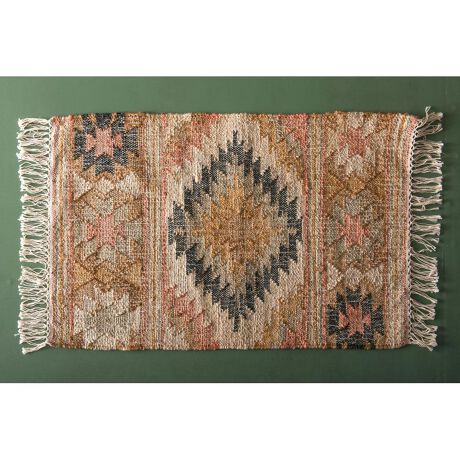 ジュートとコットンを使用したインドキリムラグ。ジュートの通気性とコットンの柔らかさが融合した幾何学模様やトライバルデザインは室内外で使用できる。