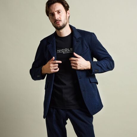 衿を折り返してラペルのようにしても着れる、スタンドタイプのジャケット。