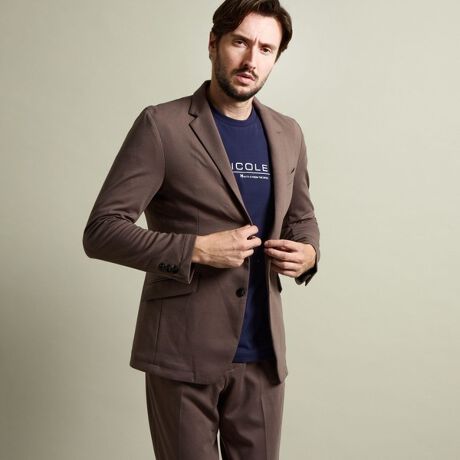 ポリエステル/レーヨン/ポリウレタンの混紡糸を編み立て、DIGNEATという形態安定性のあるポンチ素材を使用。